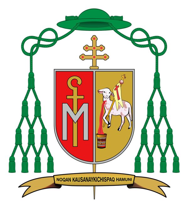 La banda del escudo ostenta el lema en el idioma Quechua: “Noqan kausanayquichispaq hamuni”, que traducido al español dice: “Yo he venido para que tengan vida“, y se refiere a la cita biblica de Jn. 10, 10, en el discurso de Jesús, el Buen Pastor, que da la vida por sus ovejas, cuya frase deseo hacer vida en mi ministerio episcopal en la Arquidiócesis del Cusco.