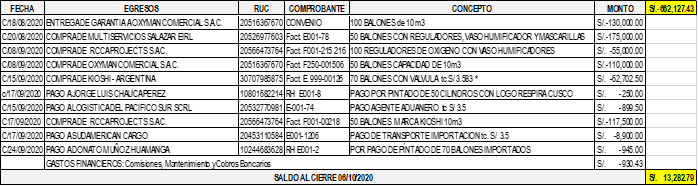 De igual modo la Bióloga Gardenia Ruth Jiménez Villavicencio, decana del colegio de biólogos de Cusco y Vice presidente de CONREDE, dio el informe económico y de gastos efectuados para la adquisición de cilindros de oxígeno de 10 m3 + reguladores de oxígeno, detallado de la siguiente forma: